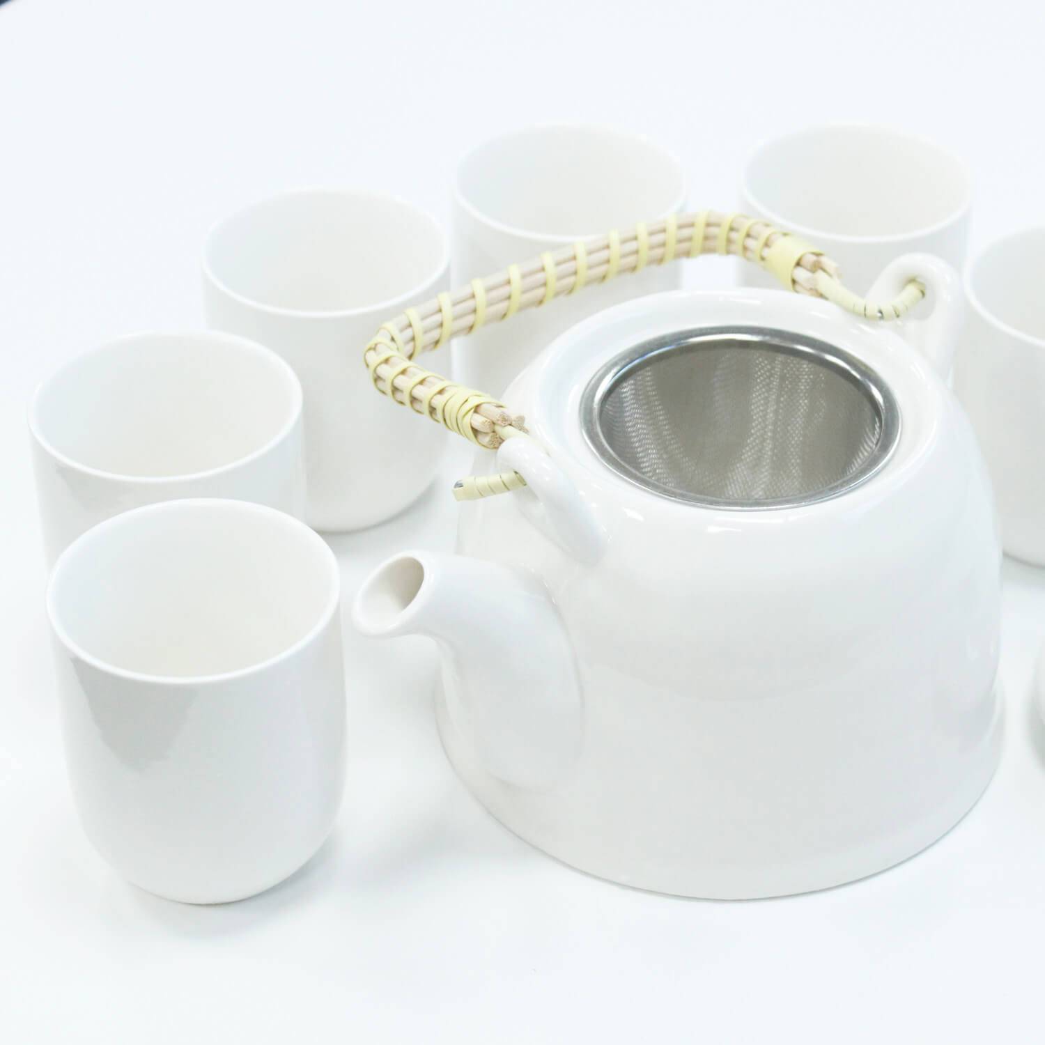 Discover the art of tea brewing with this exquisite 7-piece ceramic tea set that transforms any tea ritual into a moment of pure indulgence. Crafted from premium white ceramic with a pristine, glossy finish, this sophisticated set includes a generously-sized teapot featuring an integrated fine-mesh stainless steel strainer and six perfectly proportioned matching cups.